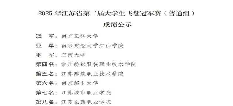 10月26日,2025年第二届飞盘冠军赛在南京溧水体育公园落幕。经过两日角逐,我校飞盘队凭借出色战术配合与顽强竞技精神,跻身八强并获第七名,刷新队史最佳纪录,实现我校省级飞盘赛事历史性突破,为校体育事业添彩。