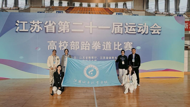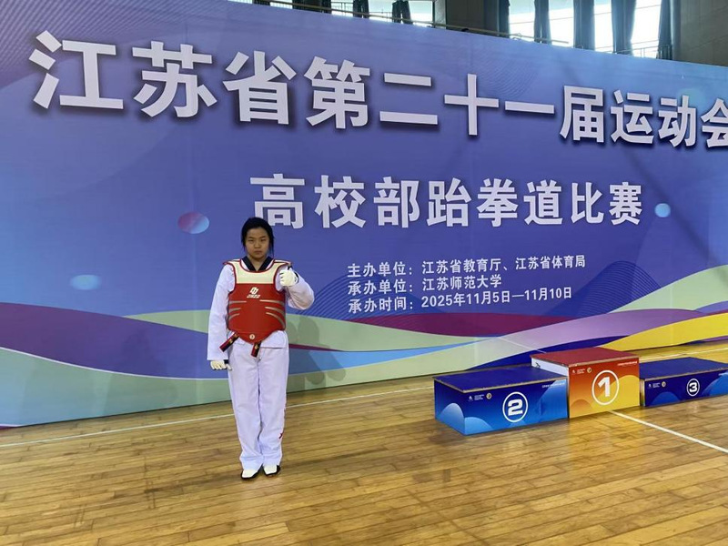 江苏省第21届大学生运动会跆拳道项目近日在江苏师范大学落下帷幕。我校环境生态学院王天楠,何欣妍,施京雪,张美月四名同学首次参加该赛事。其中何欣妍同学历经多轮激烈角逐,在女子72+公斤级别赛事中奋勇争先,以出色的竞技表现斩获该级别第五名,为学校赢得荣誉,彰显了我校学子的专业素养与拼搏精神。